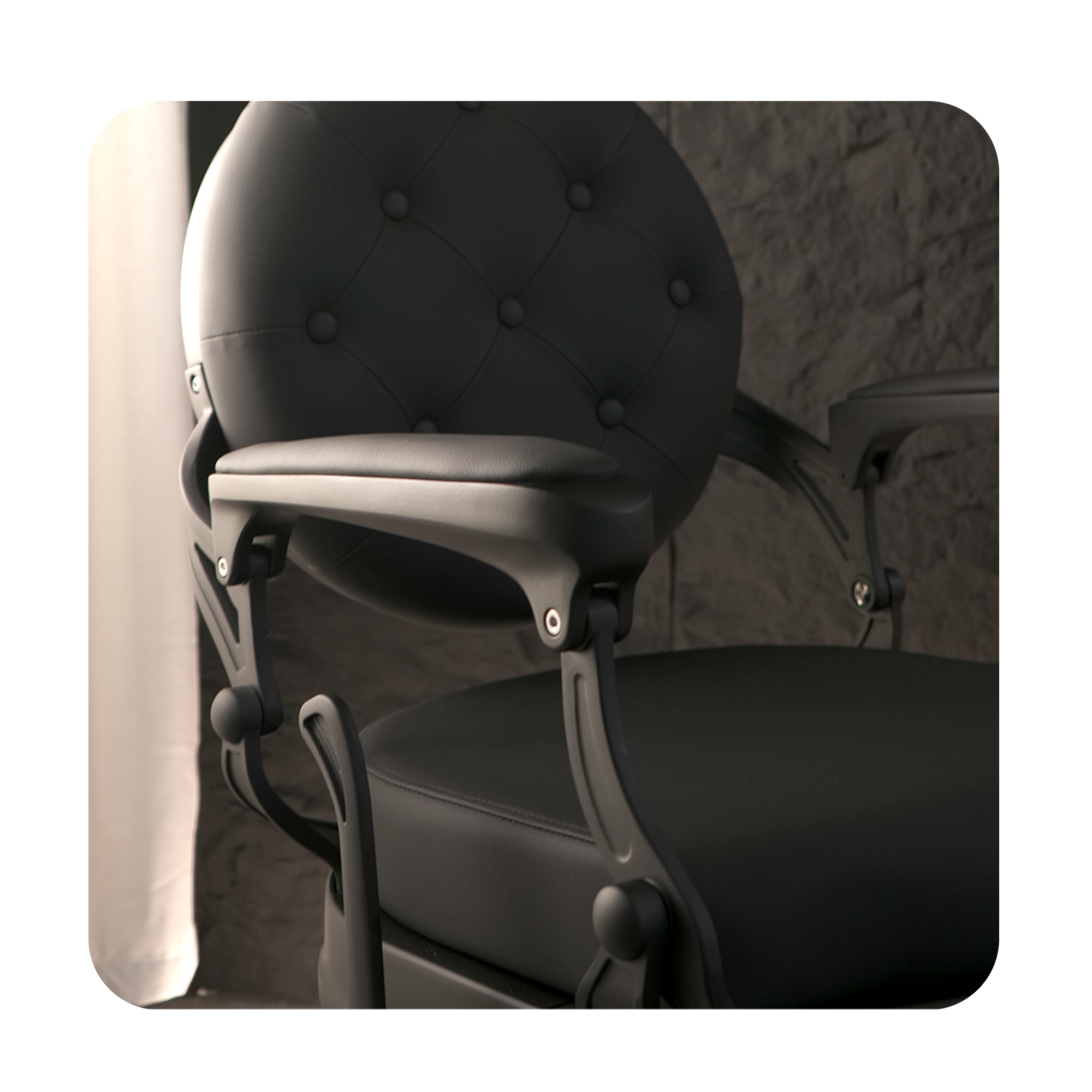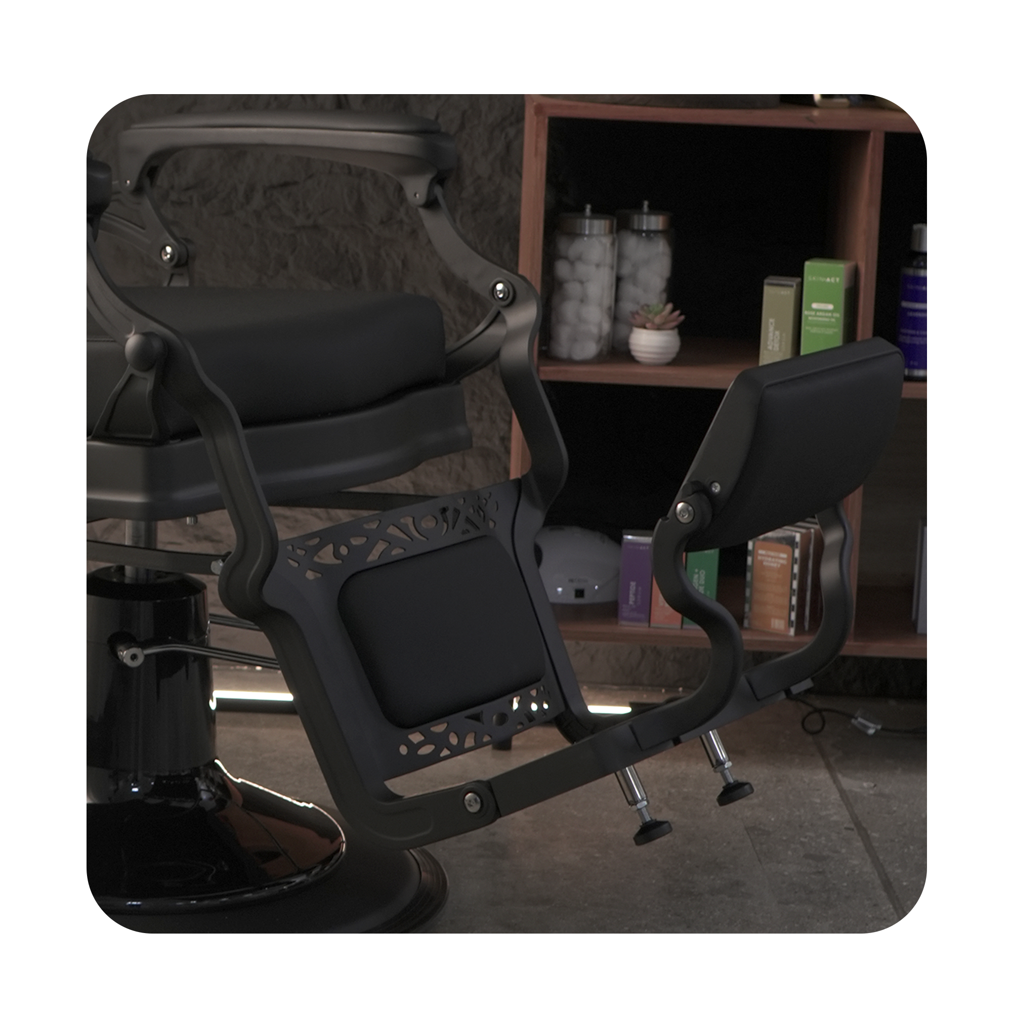 The Legacy Barber Chair is built for professionals who value both comfort and durability. Designed with an ergonomic structure, it offers a 360-degree rotation for effortless maneuverability, reducing strain and enhancing workflow. Its sleek matte black finish adds a touch of elegance, making it a statement piece in any barbershop. Upholstered in high-quality synthetic leather and supported by a sturdy chrome base, this chair is made to withstand the demands of a busy salon while maintaining its sophisticated appearance. Equipped with a hydraulic oil pump, it provides smooth and quiet operation, ensuring an effortless experience for both barbers and clients.