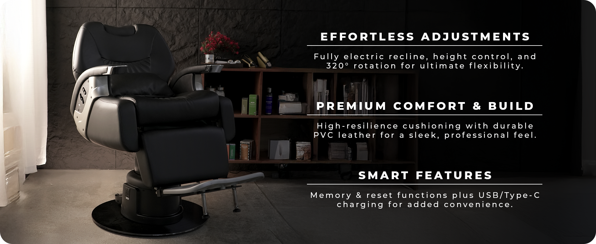 Enhance efficiency with memory and reset functions that allow you to save preferred seating positions and easily return to default with a single touch. The built-in USB and Type-C charging ports keep essential devices powered up, ensuring convenience for both barbers and clients. These advanced features streamline operations and provide a modern touch to the barbershop experience.